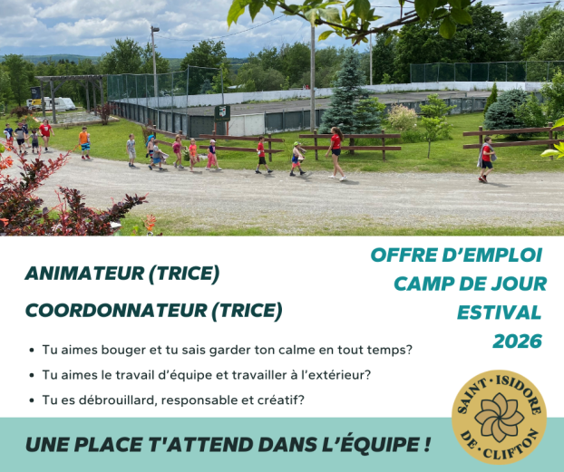 Accueil / Saint-Isidore-de-Clifton / Actualités / Offre d'emploi / Offre d’emploi – camp de jour 2026